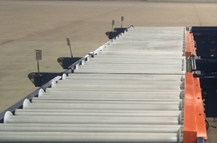 双链辊道机电机驱动滚筒转动,滚筒通过与货物的摩擦力驱动货物运行。滚筒与滚筒之间是通过链条传递动力的,保证了动力的平稳性。滚筒两侧焊有法兰盘,保证货物在输送过程中的顺畅性。